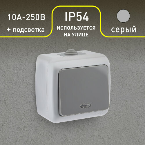 Intro 5-102-03 Выключатель Atlantic 5-102-03 с подсветкой, 10А-250В, IP54, открытой установки, серый, цена за 1 шт
